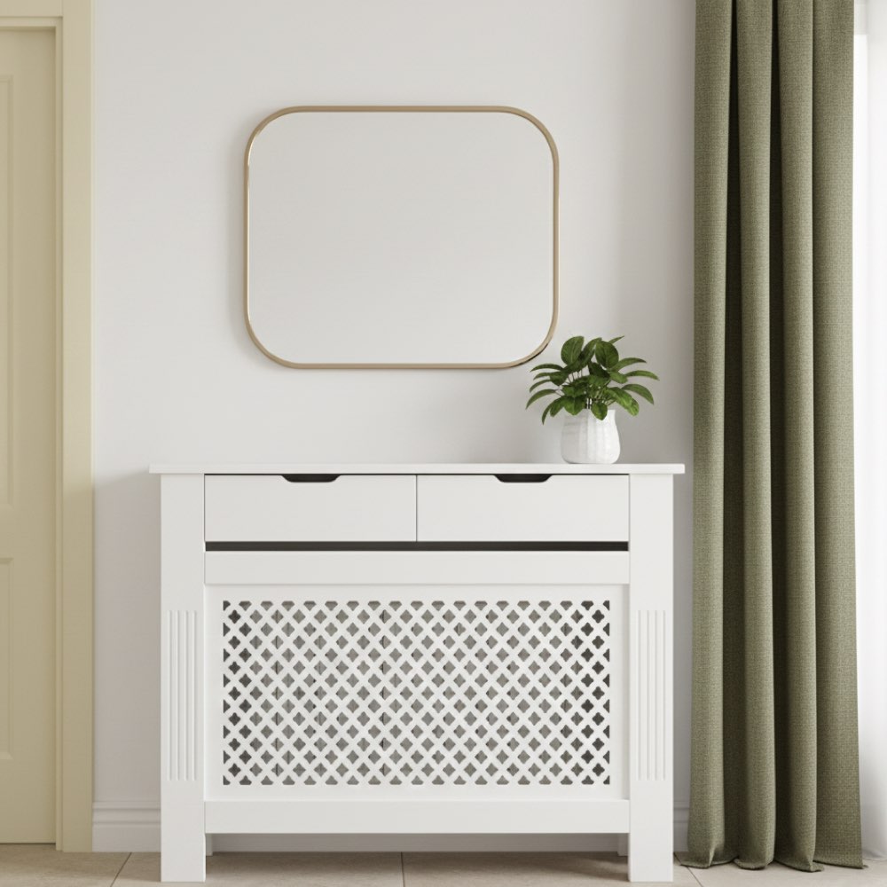 Descriere: Mască pentru calorifer, realizată integral din MDF și HDF, vopsită mat în culoarea RAL 9003 (alb). Fabricat la comandă după măsurători. Topul măștii include 2 sertare cu mâner ascuns, sertarele se acționează trăgând de latura de jos a sertarului. Glisiere metalice pentru sertar. Interiorul măștii (topul și lateralele) se izolează termic cu folie reflectivă. Capacul frontal este decupat pentru a permite ieșirea neîngrădită a aerului cald. Masca se ancorează în perete.